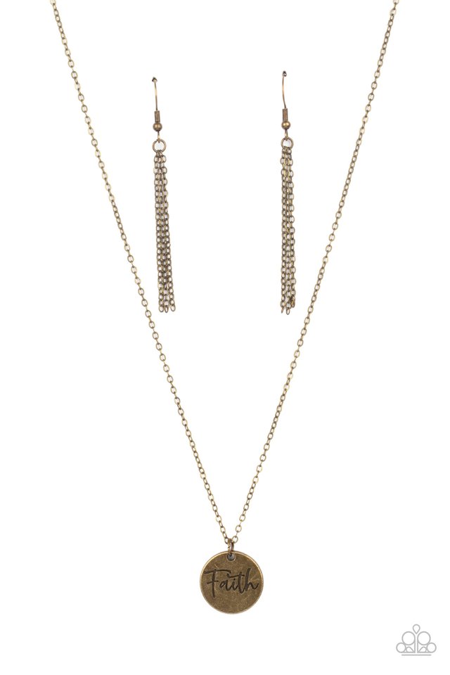 A dainty brass disc is stamped in the word, "Faith," at the bottom of a rustic brass chain, creating an inspiring pendant below the collar.